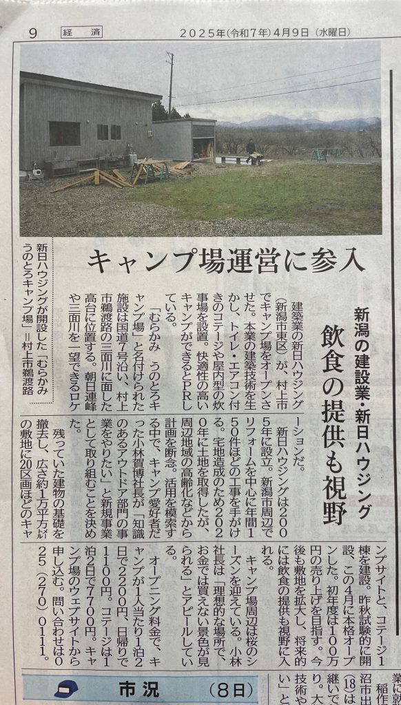 4月9日(水)の新潟日報朝刊にむらかみうのとろキャンプ場の記事が載りました。
